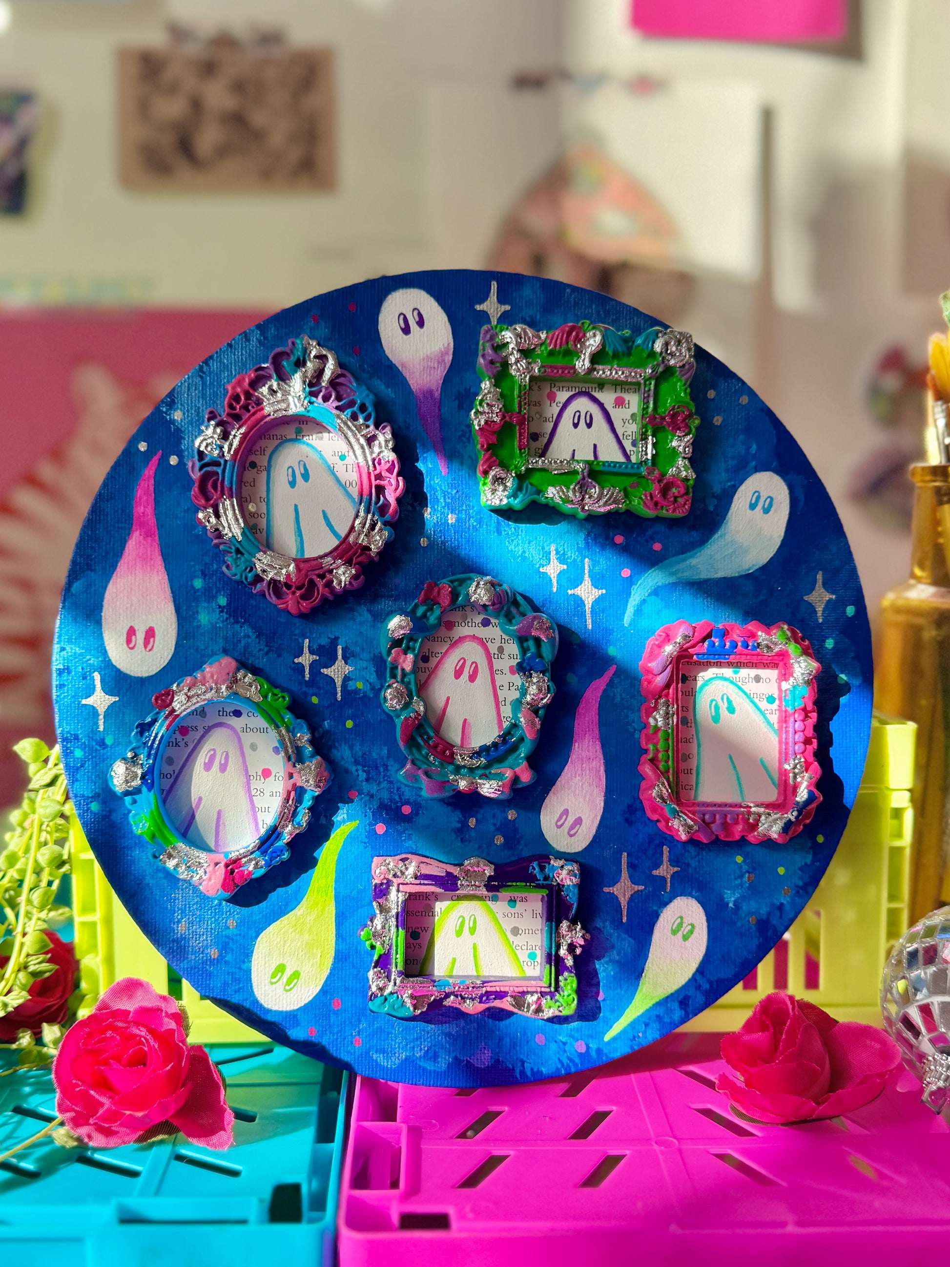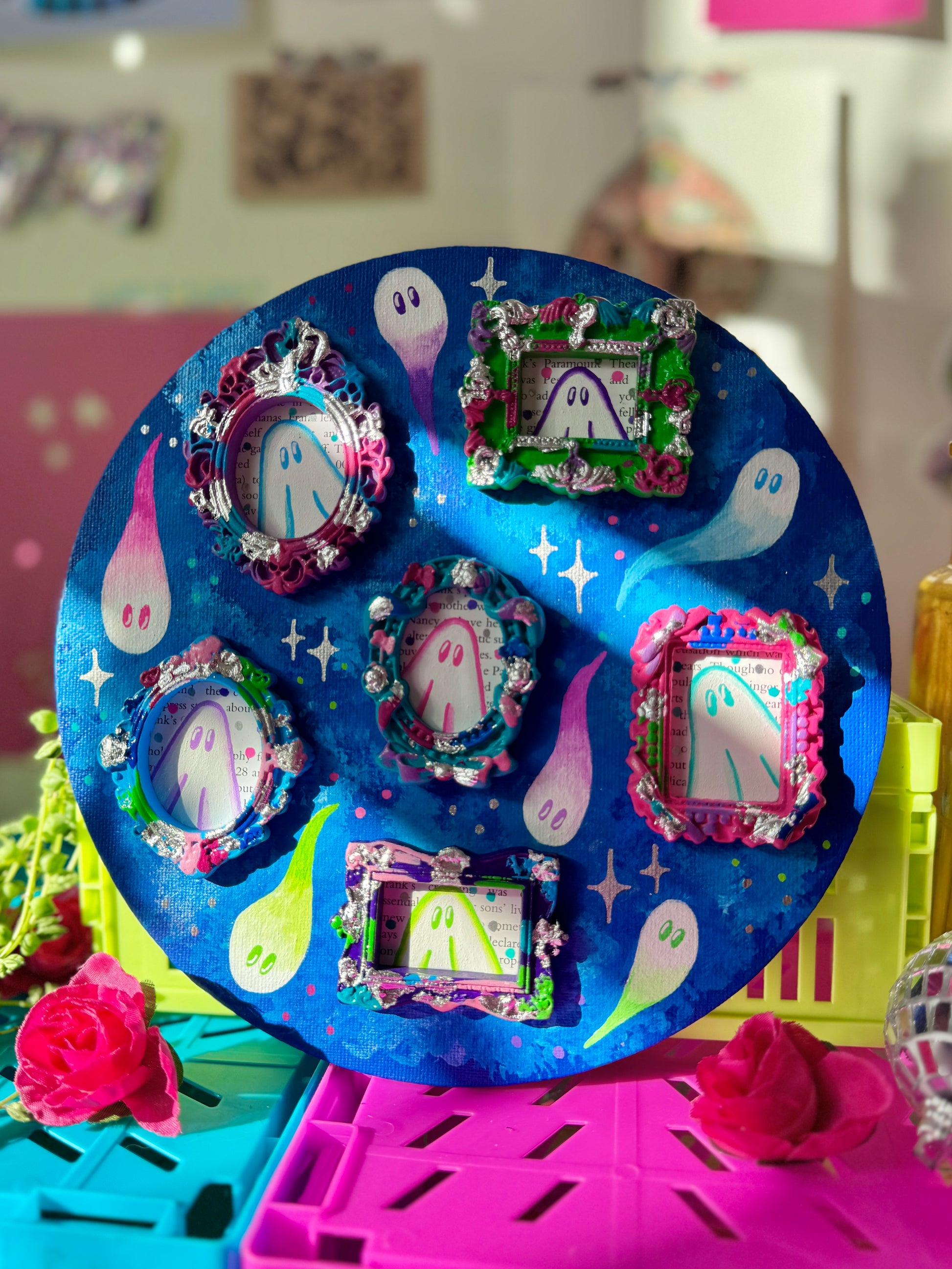 20cm size circle canvas board acrylic painted and adorned with mini painted ghost frames, handpainted by myself, and gloss varnished.