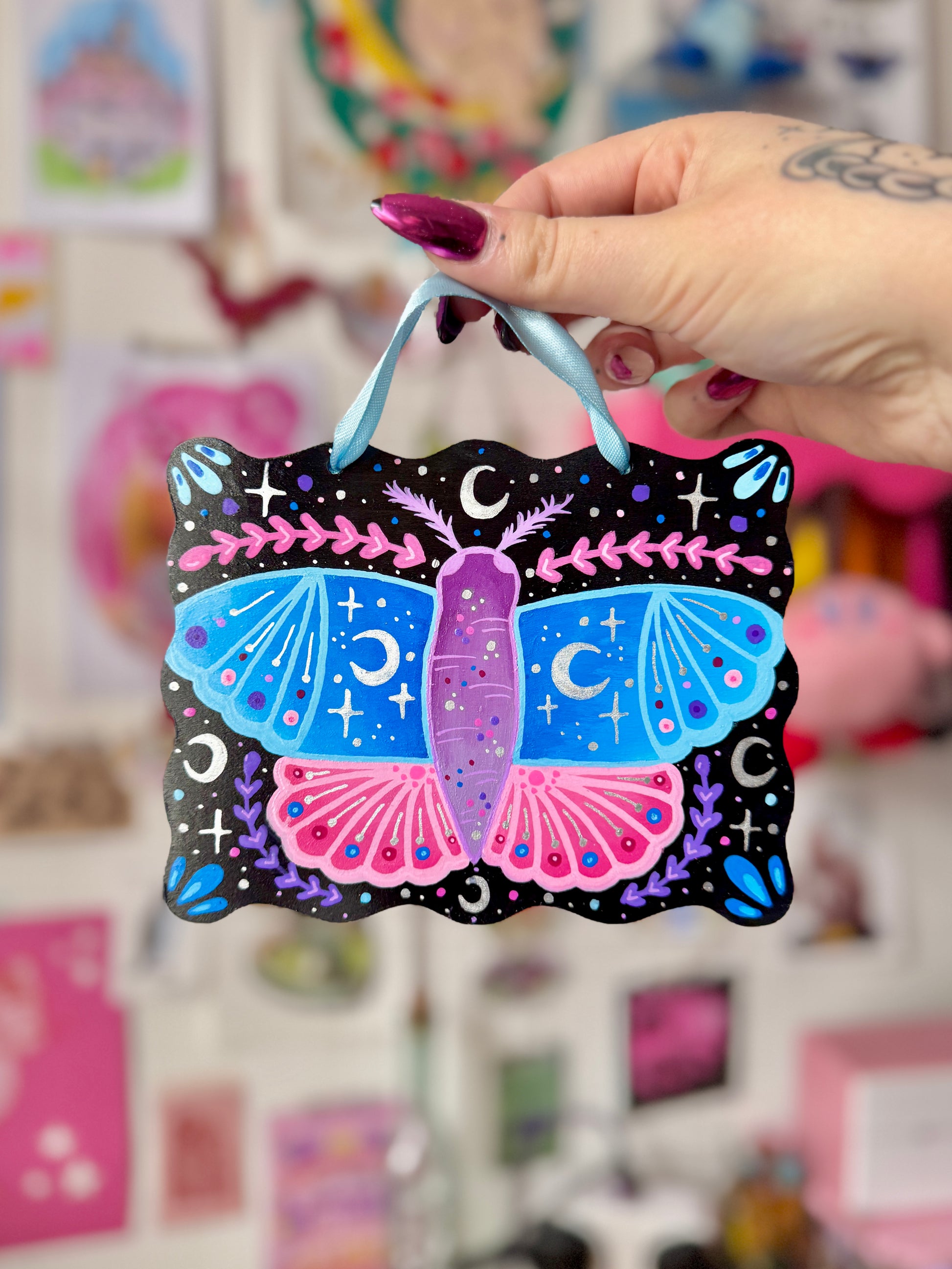 Wooden plaque blank, painted with acrylics and decorated with posca pens, then varnished. Comes with ribbon attached as shown to hang up as you please! These are approx 10-15cm wide