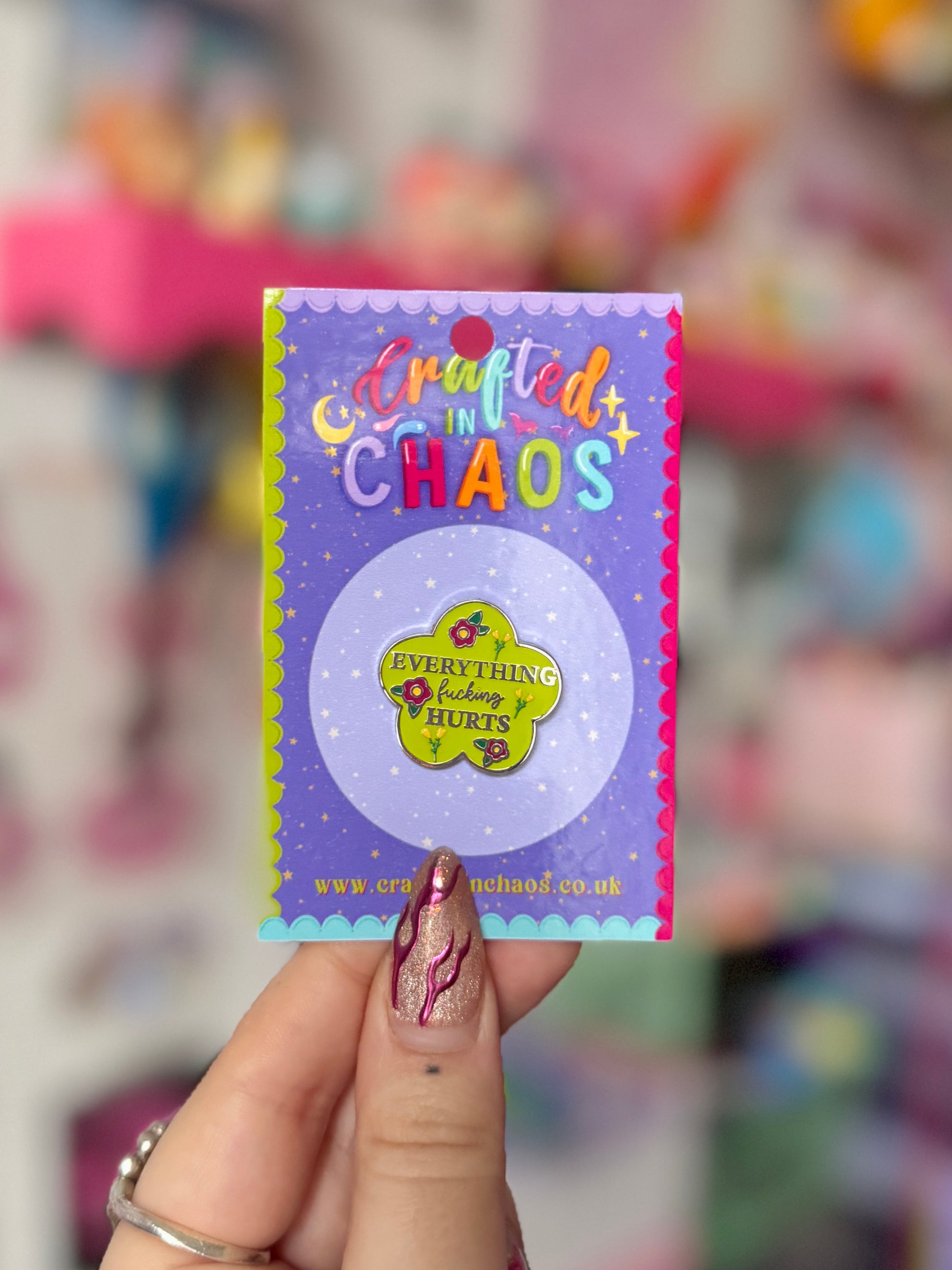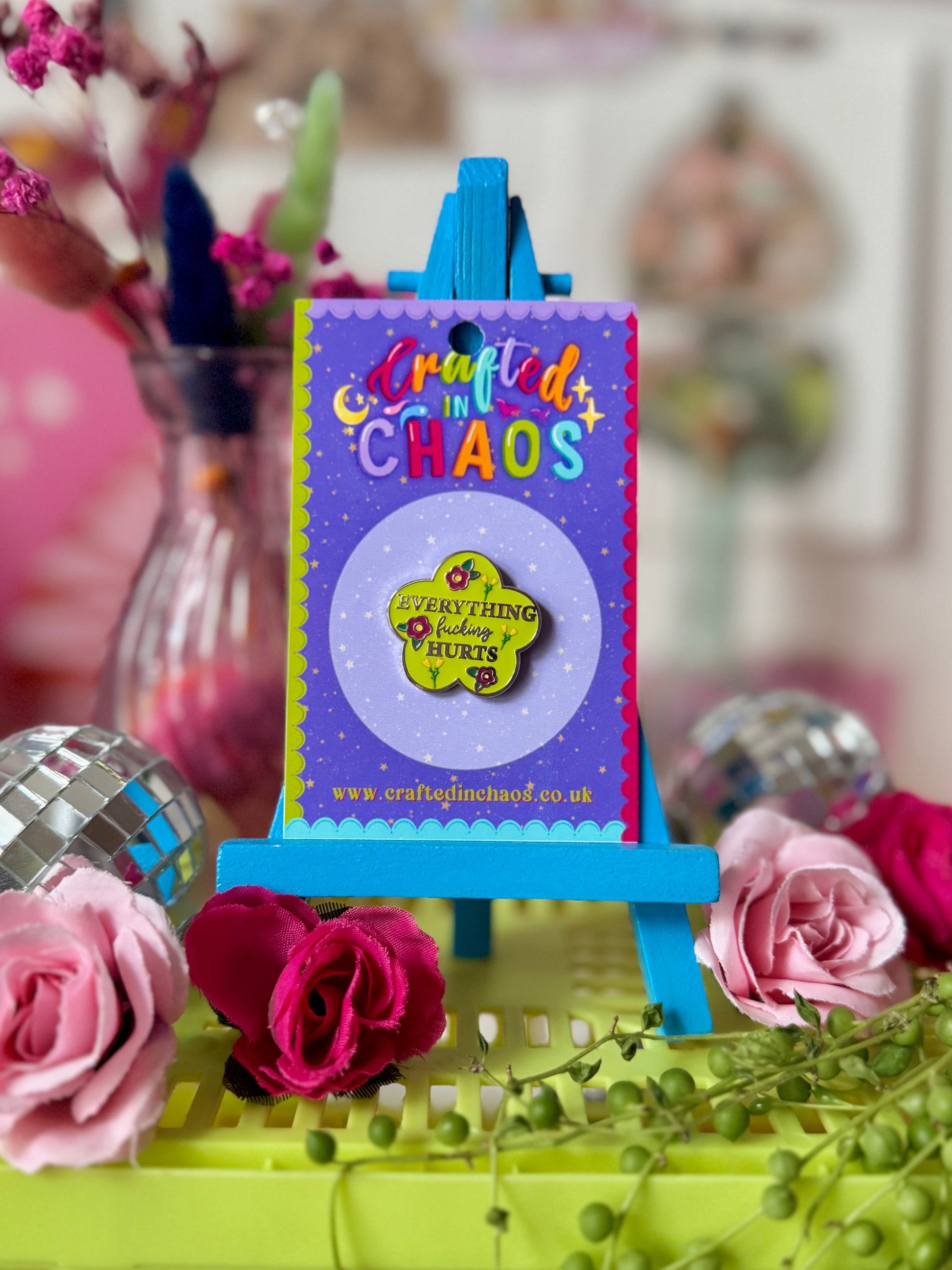 One 25mm hard enamel, silver plated pin of flower that says “everything fucking hurts” designed by me, with metal clasping. Buy 2 for £14, 3 for £20 or all 4 colours for £26!