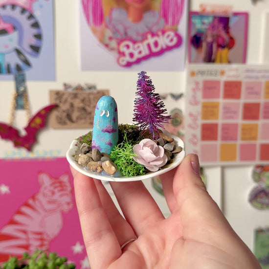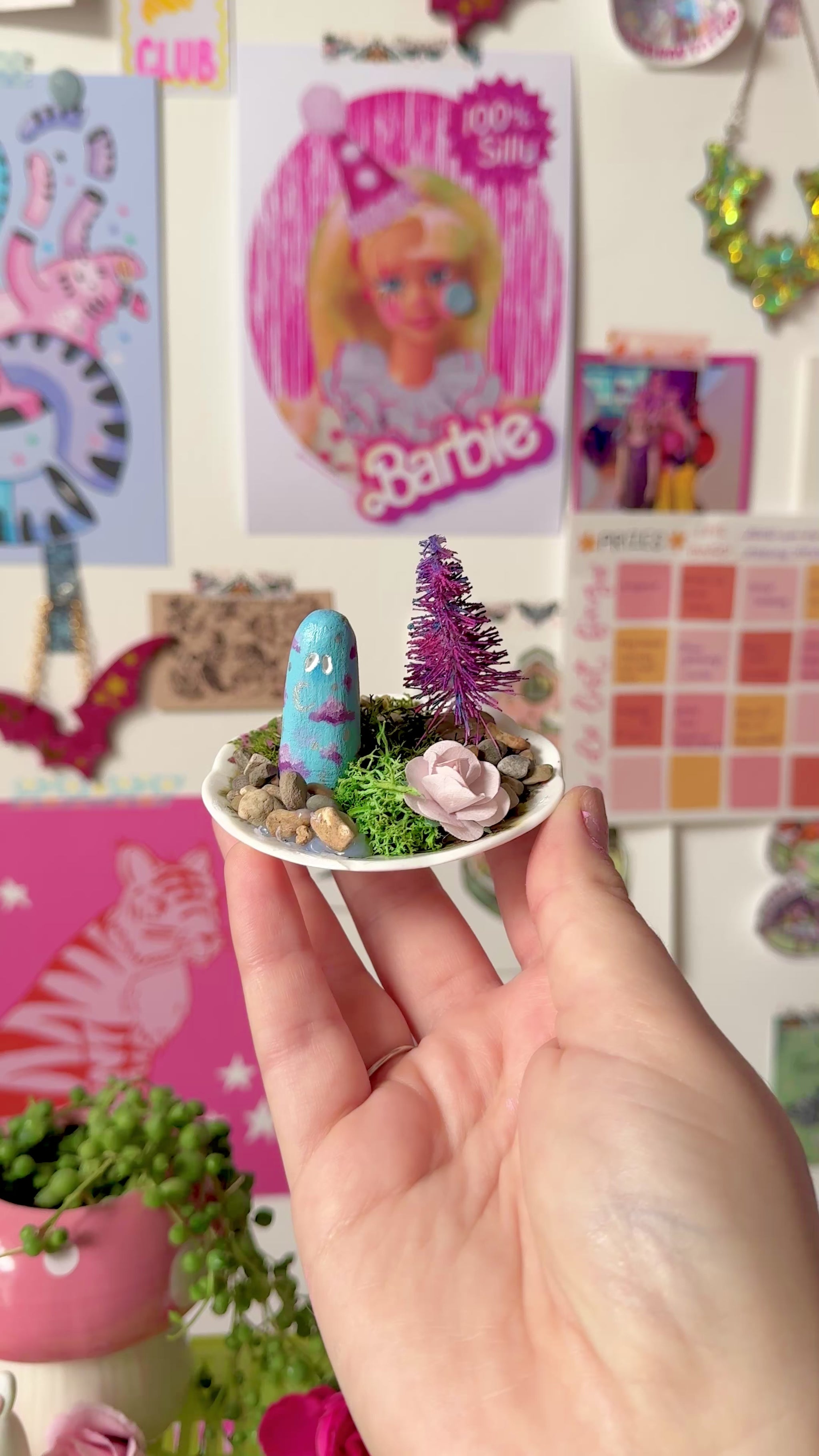 Air dry clay ghost painted with acrylics and decorated with posca pens, then varnished and put on a thrifted porcelain plate with decor. This is approx 7.5cm wide.