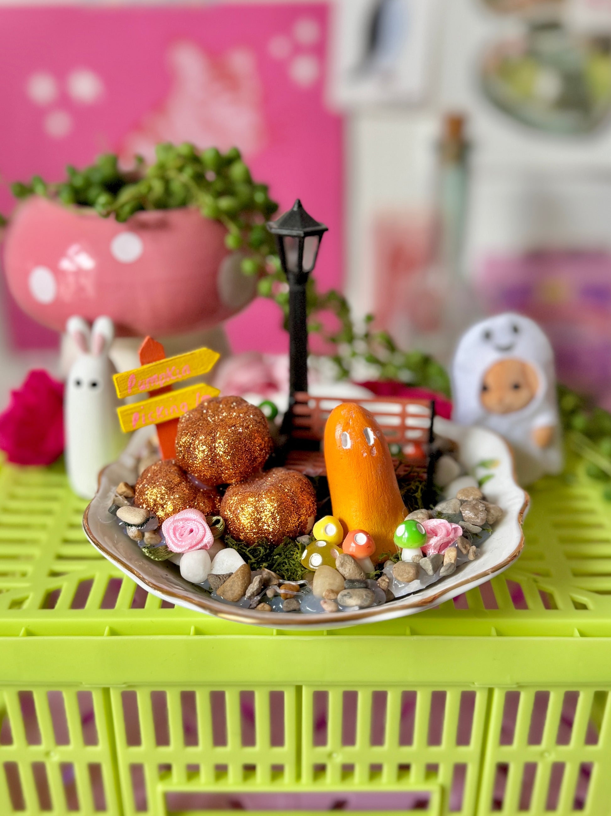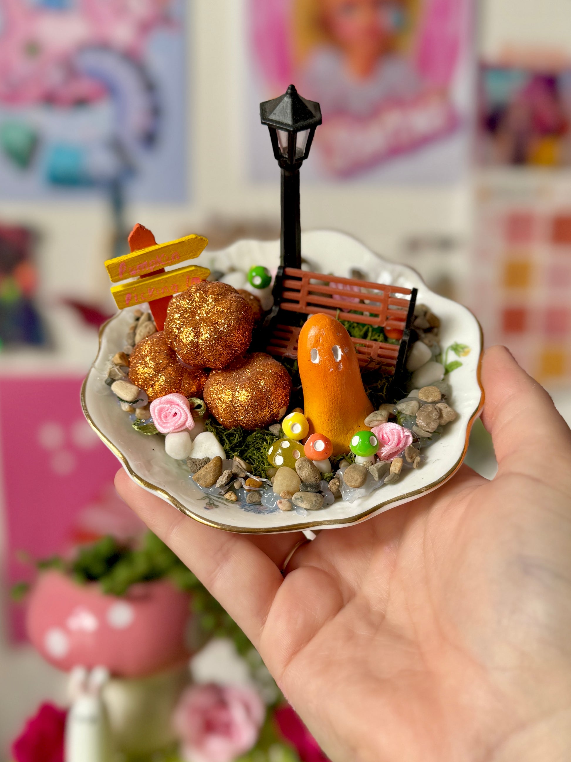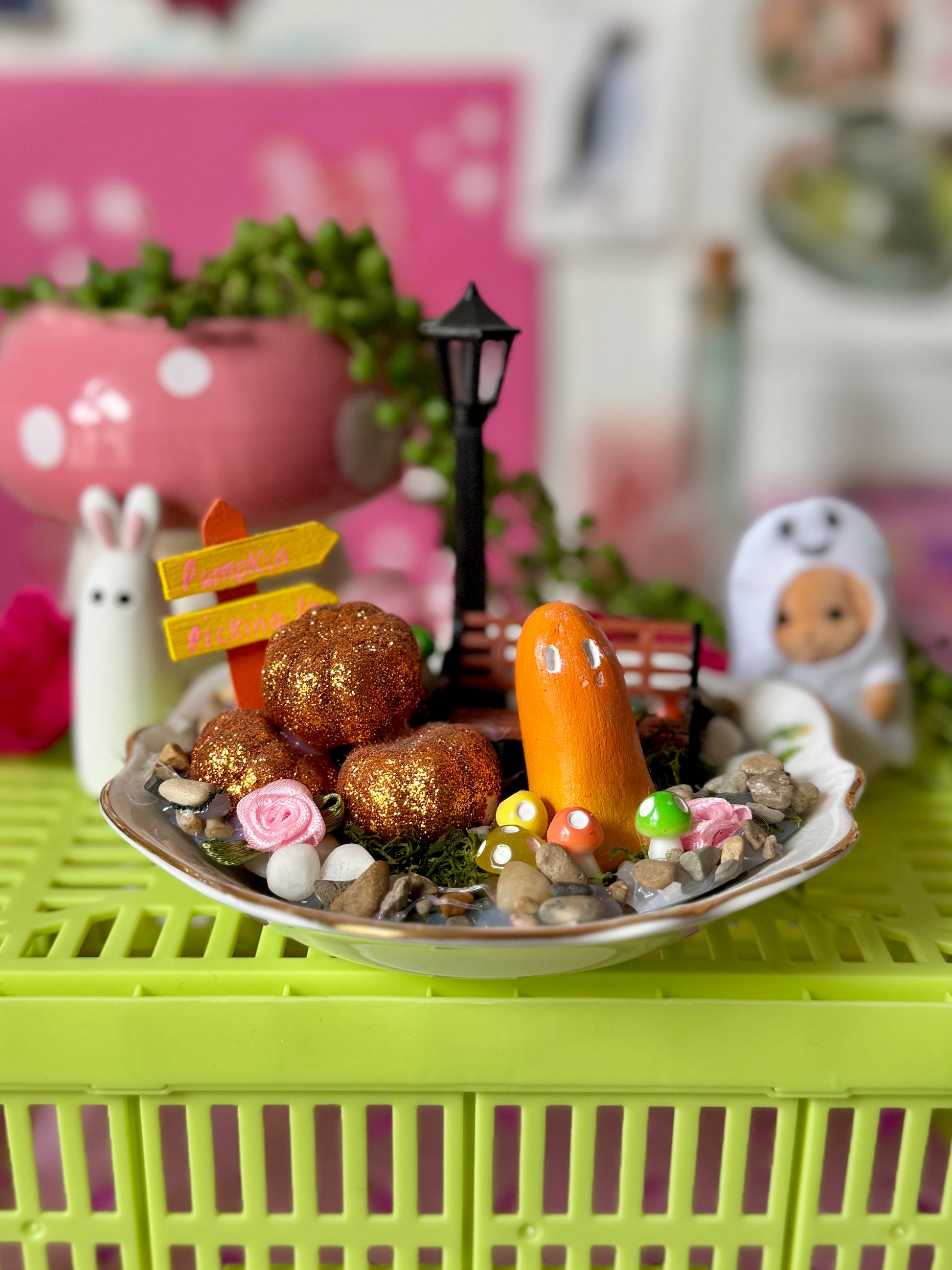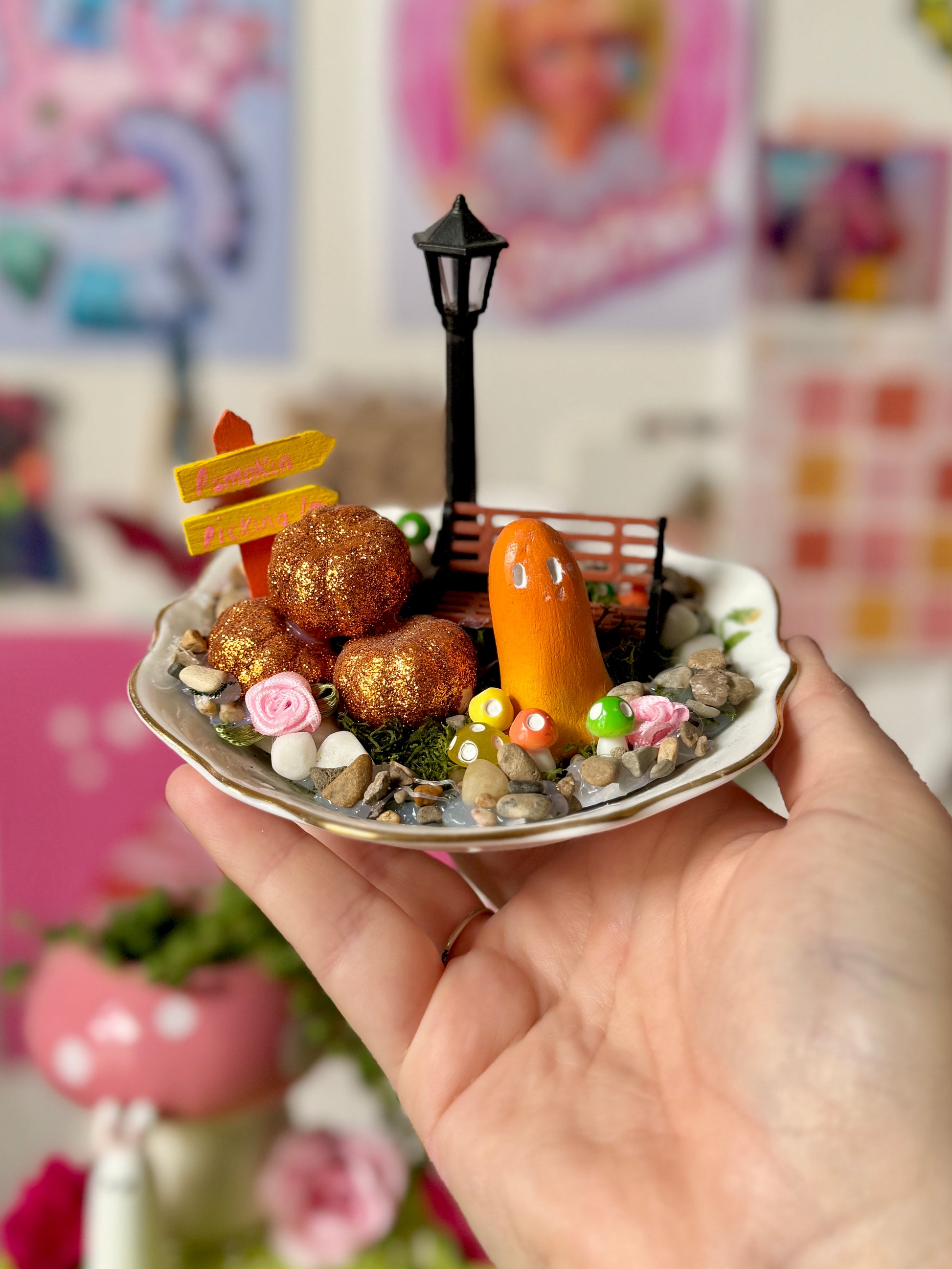 Air dry clay ghost painted with acrylics and decorated with posca pens, then varnished and put on a thrifted porcelain plate with decor. This is approx 13cm wide.