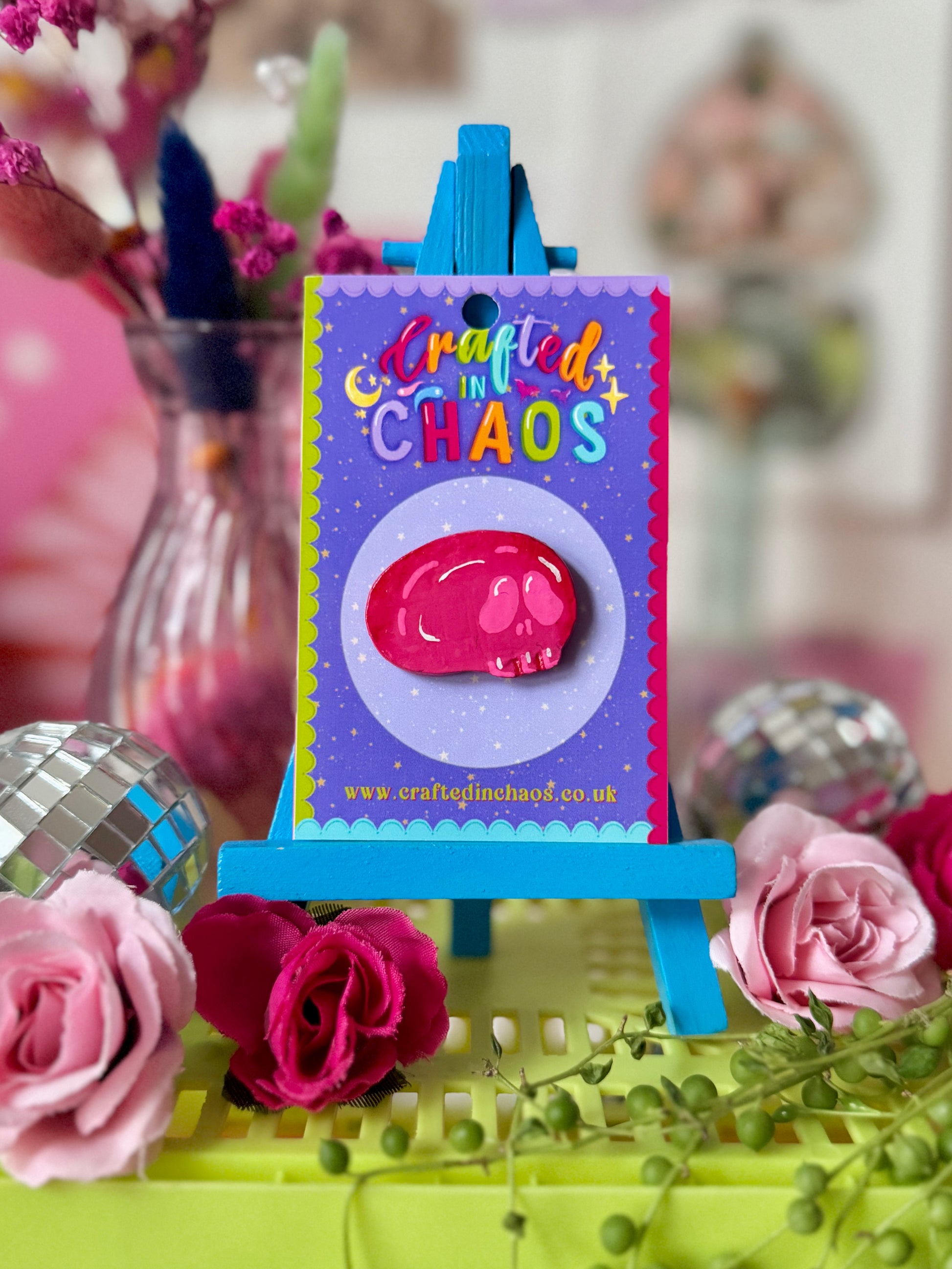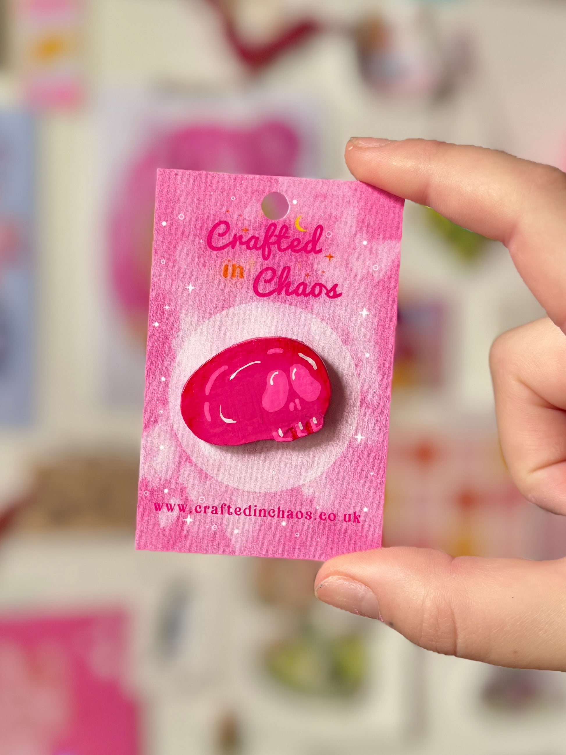 Air dry skull clay pin, painted with acrylics and decorated with posca pens, then varnished. Comes with butterfly back attachment. These are approx 3cm wide. These should ideally be put on display, please see below details